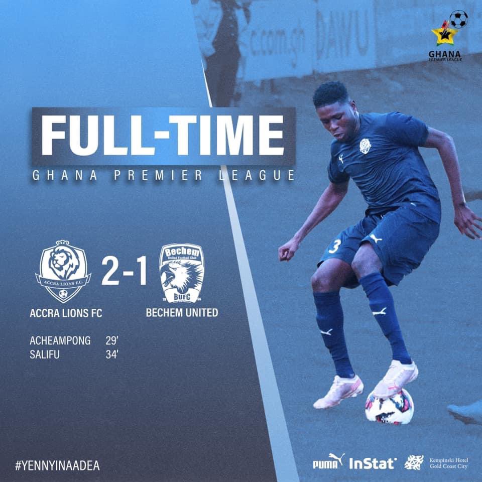 Accra Lions defeated Bechem United 2-1 on matchday four of Ghana Premier League at the Accra Sports Stadium on Saturday.