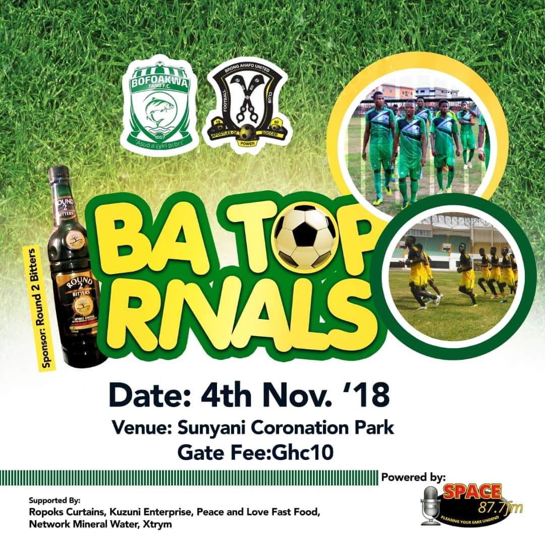 As part of efforts to promote association football in the Brong-Ahafo region, Sunyani based Space FM in collaboration with Round 2 Bitters is bringing the two most glamorous teams in the region, BA United and Tano Bofoakwa together in a friendly encounter.