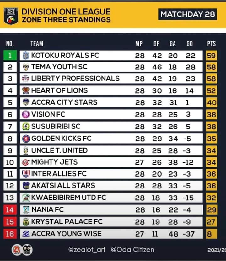 Therefore, any of Kotoku Royals, Tema Youth and Liberty can be declared as the winners of Zone 3 on final day of the season.