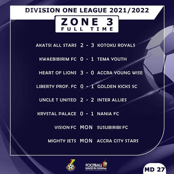 The next three games will be played for mere formality. However, Ebusua Dwarfs could be granted promotion on sporting merit after Ashanti Gold were demoted to Division Two for playing mat h fixing last season with. Inter Allies.
