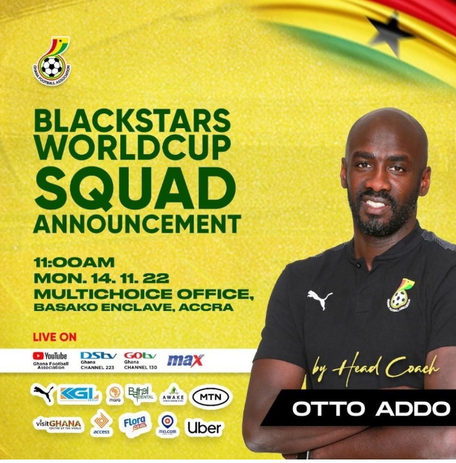 Ghana coach Otto Addo will made public the final 26-man squad that will play at 2022 Fifa World Cup on Monday in Accra.