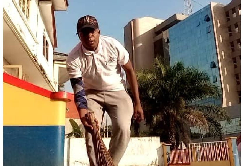 A Kumasi-based sport journalist was spotted sweeping the premises of Hearts of Oak secretariat on Monday.