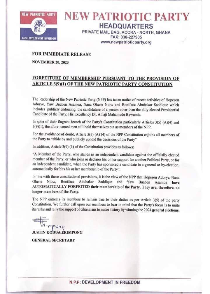 The members tha have been expelled from the party included Hopeson Adorye, Nana Ohene Ntow, Boniface Abubakar Saddique, and Yaw Buaben Asamoa.