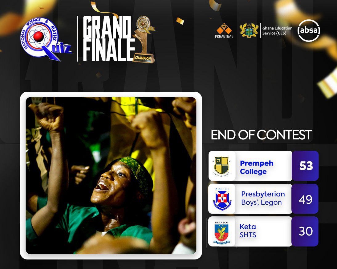 Kumasi-based Prempeh College have been crowned winners of the 2021 National Science and Math Quiz after pipping Presbyterian Boys’ Senior High School and Keta Senior High and Technical School in the final held at Kwame Nkrumah University of Science and Technology on Friday in Kumasi.