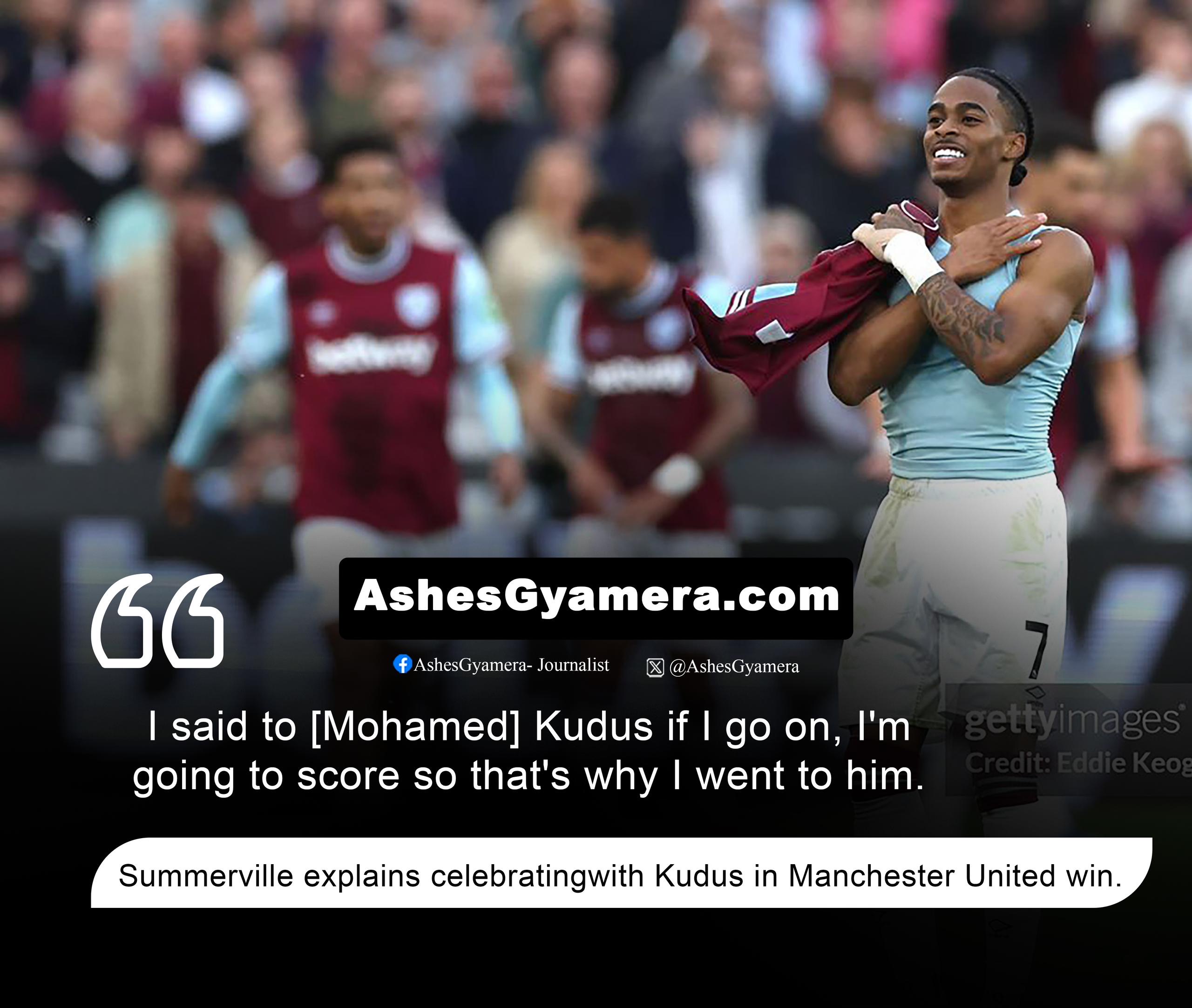 West Ham United winger Crysencio Summerville has shed light on why he ran towards the bench to celebrate with suspended Mohammed Kudus after scoring against Manchester United in Premier League on Sunday.