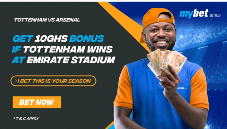 Mybet.africa is offering sports punters a huge 10 GHs bonus on the London derby, should Tottenham win at the Emirates Stadium. To be eligible for this offer, punters will have to place a 20GHs bet to include the Tottenham match.