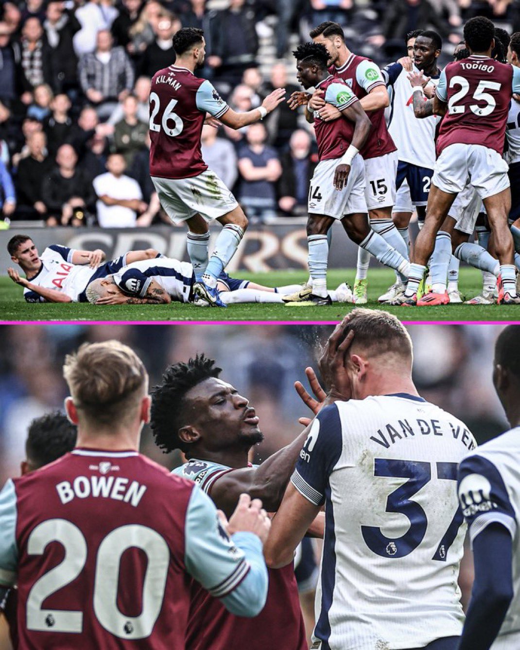 Mohammed Kudus was shown a red card after hitting a Tottenham player in West Ham’s 4-1 defeat in East London derby in Premier League on Saturday.